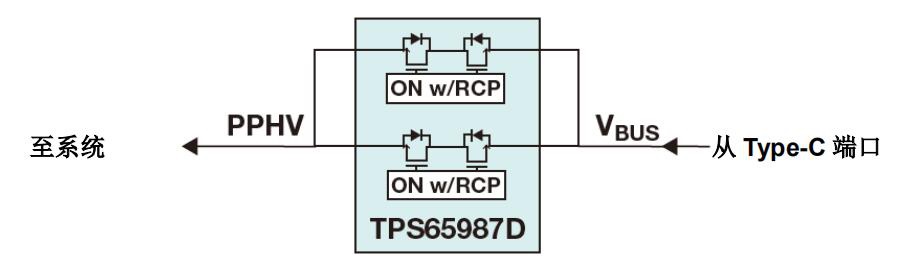 根據(jù) USB PD 協(xié)議,在其配置通道(CC)線路上帶有RD 的設(shè)備必須將 DC/DC 控制器的輸出電容與 VBUS 隔離。在這種情況下,系統(tǒng)必須具有 VBUS FET 以滿足此協(xié)議。TPS65987D 有兩個(gè)高壓背對(duì)背集成 FET,可滿足此要求。TPS65987D 中的內(nèi)部 FET 在 25°C 環(huán)境溫度下的 RDS(on)約為 25mΩ。對(duì)于高電流應(yīng)用,此電阻可能太高。當(dāng) 5 A 的電流通過(guò)其中一個(gè)內(nèi)部 FET 時(shí),F(xiàn)ET中將消耗大約 750 mW 的功率。通過(guò)雙電源模式,TPS65987D 能夠同時(shí)并聯(lián)關(guān)閉其兩個(gè)內(nèi)部電源路徑。這種模式有效地將電源路徑的 RDS(on)減半,并且還使FET 內(nèi)部的功耗減半。圖 3 重點(diǎn)說(shuō)明了 PD 控制器如何與此電源架構(gòu)連接。