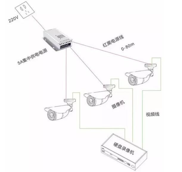 通常懂的人都知道集中供電模式是在 220V 電源處接 12V 集中電源一個,再用 2*1.0 紅黑電源線分別接給攝像頭,12V 供電距離不可超過 100 米。在接個單個電源線接頭,再把單個電源線接頭和監(jiān)控攝像頭電源接頭相連接即可。集中供電方式是指在監(jiān)控室或某個中間點采用 12V 開關(guān)電源向前端負(fù)載集中供電。與獨立供電模式相比,最大的差別在于一個電源可以為多個攝像機提供電力供應(yīng)。