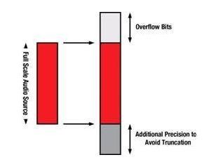在頂端,共有9個位,用于防止音頻數(shù)據(jù)意外飽和。例如,如果你使用一個24-dB增壓的均衡器(EQ),并且你輸入一個“全量程”16位字,則你可能會非有意地讓信號飽和,也即增加失真,而這與我們努力的方向背道而馳。