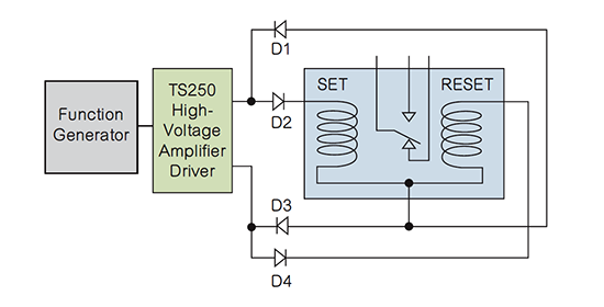 圖3:僅使用一個(gè)函數(shù)發(fā)生器和一個(gè)高壓驅(qū)動(dòng)器來測(cè)試雙線圈繼電器。