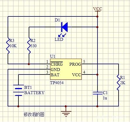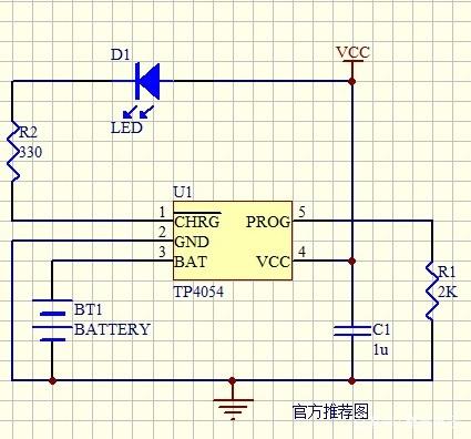 最近在使用TP4054鋰電充電芯片時遇到一個奇怪的問題,充滿電后指赤燈有時會滅有時不會滅只是亮度降低,讓我很迷惑,后面經(jīng)過分析與測量最終解決此問題。造面此問題的原因是此芯片的CHRG(引腳1)腳在充滿電時為高阻狀態(tài),但仍有極奇微弱的電流,這樣就會造成一些高亮的LED仍能點亮。后面在此引腳上加一上拉電阻后完美解決問題,現(xiàn)附原理圖如下: