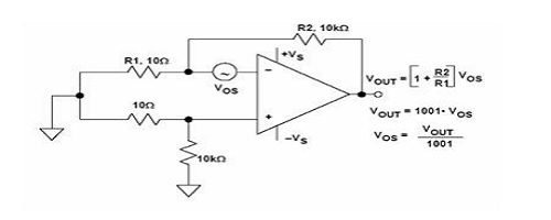 對于失調(diào)電流,則是用一個很大的電阻接在反饋回路上。S1閉合時,測同相端的偏流Ip,S2閉合的時候測反相端的偏流In。