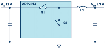 在負載點(POL)降壓轉(zhuǎn)換器領(lǐng)域,同步變化的高邊和低邊有源開關(guān)已被廣泛使用。圖1顯示了具有理想開關(guān)的此類電路。與使用無源肖特基二極管作為低邊開關(guān)的架構(gòu)相比,此類開關(guān)穩(wěn)壓器具有多項優(yōu)勢。主要優(yōu)勢是電壓轉(zhuǎn)換效率更高,因為與采用無源二極管的情況相比,低端開關(guān)承載電流時的壓降更低。