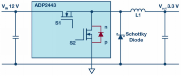 圖2.用于降壓轉(zhuǎn)換的同步開關(guān)穩(wěn)壓器,采用N溝道MOSFET和額外的肖特基二極管,可最大限度地減少干擾。