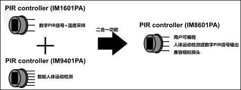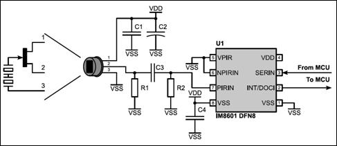 圖1  M8601 可編程數(shù)PIR信號調(diào)理芯片, 結(jié)合了數(shù)字PIR芯片和智能人體運動檢測功能