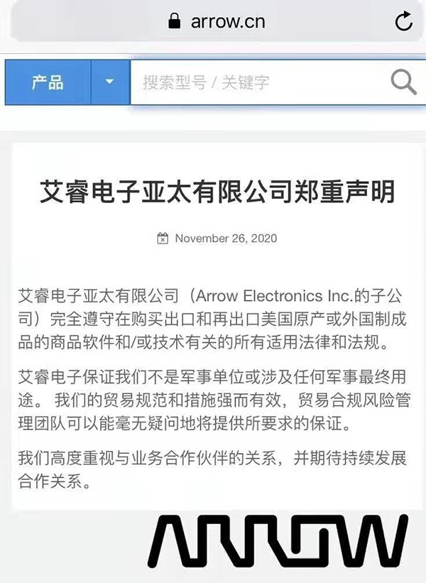 艾睿電子回應(yīng)將被美國制裁傳聞:保證我們不是軍事單位或涉及任何軍事最終用途