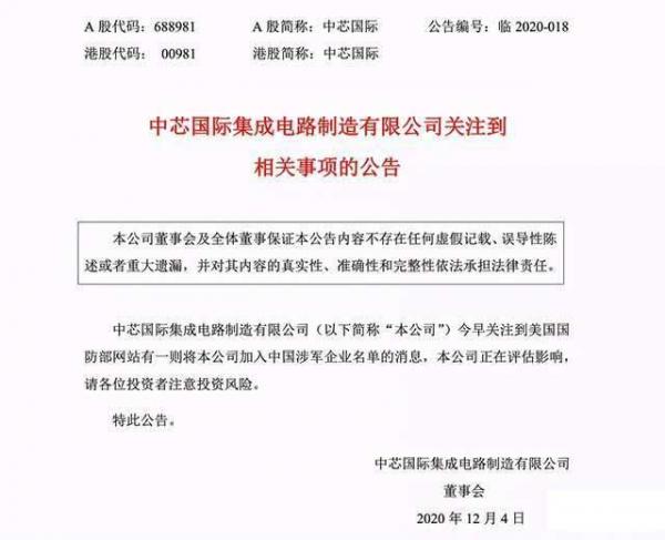 對(duì)此消息,中芯國(guó)際在12月4日開(kāi)盤(pán)前發(fā)布公告回應(yīng)稱,“中芯國(guó)際今早關(guān)注到美國(guó)國(guó)防部網(wǎng)站有一則將本公司加入中國(guó)涉軍企業(yè)名單的消息,本公司正在評(píng)估影響, 請(qǐng)各位投資者注意投資風(fēng)險(xiǎn)!
