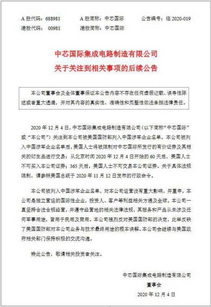 中芯國(guó)際表示,“已關(guān)注到本公司被美國(guó)國(guó)防部列入中國(guó)涉軍企業(yè)名單。本公司被列入中國(guó)涉軍企業(yè)名單后,美國(guó)人士將被限制對(duì)中芯國(guó)際所發(fā)行的有價(jià)證券及其相關(guān)的衍生品進(jìn)行交易:從北京時(shí)間 2020 年 12 月 4 日開(kāi)始的 60 天后,美國(guó)人士不可買(mǎi)入本公司證券;365 天后,美國(guó)人士不可交易本公司證券。關(guān)于具體法規(guī)限制,請(qǐng)參照美國(guó)總統(tǒng)于 2020 年 11 月 12 日發(fā)布的行政命令。本公司被列入中國(guó)涉軍企業(yè)名單,對(duì)本公司運(yùn)營(yíng)沒(méi)有重大影響,并重申,本公司是獨(dú)立營(yíng)運(yùn)的國(guó)際性企業(yè),投資人、客戶等利益相關(guān)方遍及全球。本公司一直堅(jiān)持合法合規(guī)經(jīng)營(yíng),并遵守經(jīng)營(yíng)地的相關(guān)法律法規(guī),其服務(wù)和產(chǎn)品從未涉及任 何軍事用途,皆用于民用及商用。本公司強(qiáng)烈反對(duì)美國(guó)國(guó)防部的決定,此舉反映 了美國(guó)國(guó)防部對(duì)本公司業(yè)務(wù)與技術(shù)最終用途的根本誤解。本公司會(huì)繼續(xù)與美國(guó)政 府相關(guān)部門(mén)保持積極的交流溝通!
