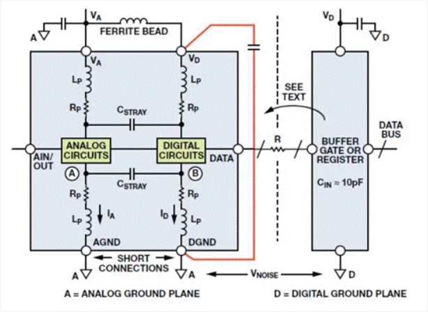 不過,為了防止進(jìn)一步耦合,AGND 和 DGND 應(yīng)通過最短的引線在外部連在一起,并接到模擬接地層。DGND 連接內(nèi)的任何額外阻抗將在 B 點產(chǎn)生更多數(shù)字噪聲;繼而使更多數(shù)字噪聲通過雜散電容耦合至模擬電路。請注意,將 DGND 連接到數(shù)字接地層會在 AGND 和 DGND 引腳兩端施加 VNOISE,帶來嚴(yán)重問題!