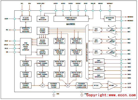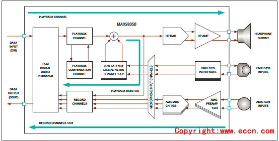 圖3.MAX98050 PCM輸入和輸出音頻數(shù)據(jù)通路圖