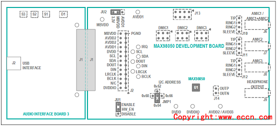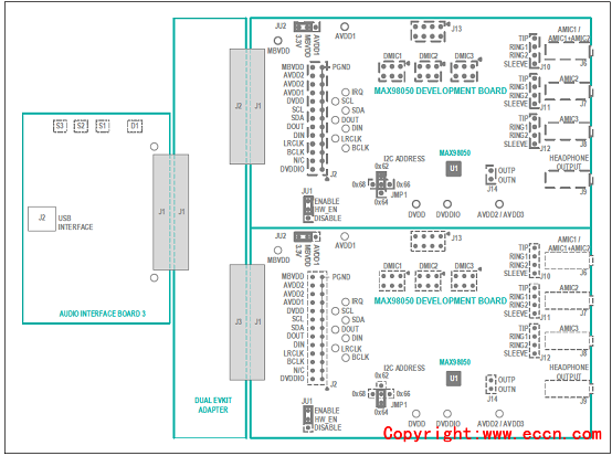 The AUDINT3 board provides all of the necessary supply voltages for proper operation of MAX98050. In addition, the AUDINT3 provides the USB-to-PCM and USB-to-I2C interfaces that are needed to evaluate the system. The Simplified EV System Block Diagrams show details of the DEV boards, Dual EVKit Adapter board and connection with the AUDINT3 board.