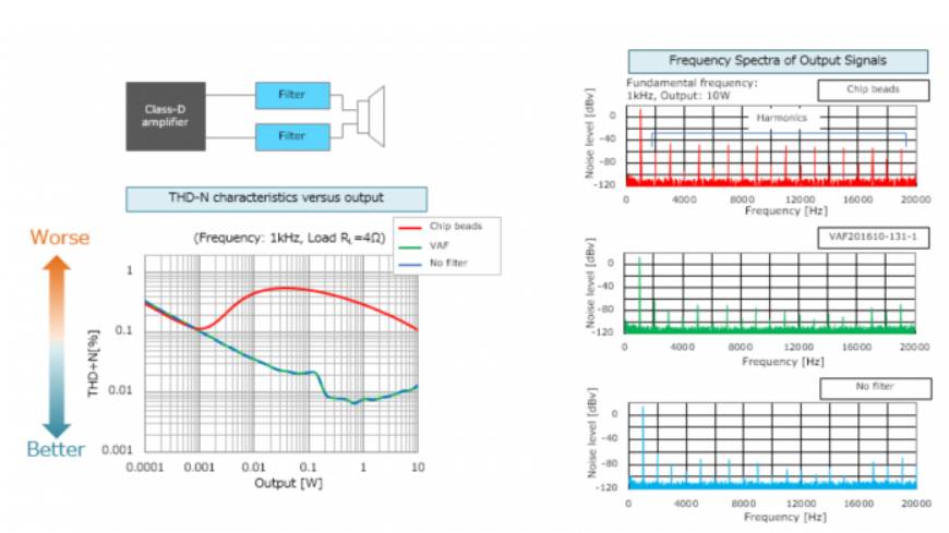 與不使用濾波器相比,噪聲抑制濾波器在輻射噪聲抑制方面的效果等同于關(guān)閉D類放大器時(shí)的效果。例如,TDK的MAF系列濾波器是多層芯片組件,它們使用一種新型的鐵氧體材料來實(shí)現(xiàn)低失真,同時(shí)保持其噪聲消除特性。