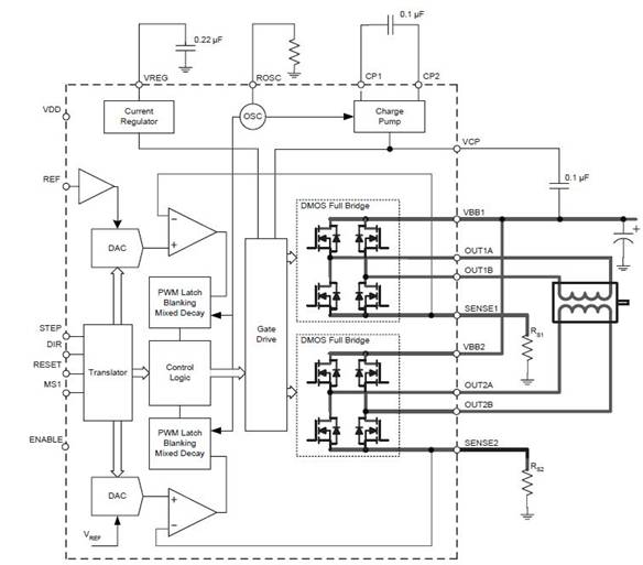 而轉(zhuǎn)換器的特性則大大簡化了電機控制系統(tǒng)的設計。只需在STEP輸入引腳上施加一個脈沖,電機即被驅(qū)動一步,無需相序表或高頻控制線。因此,在主機微控制器不可用或負載過重的應用中,A3982是最佳選擇。