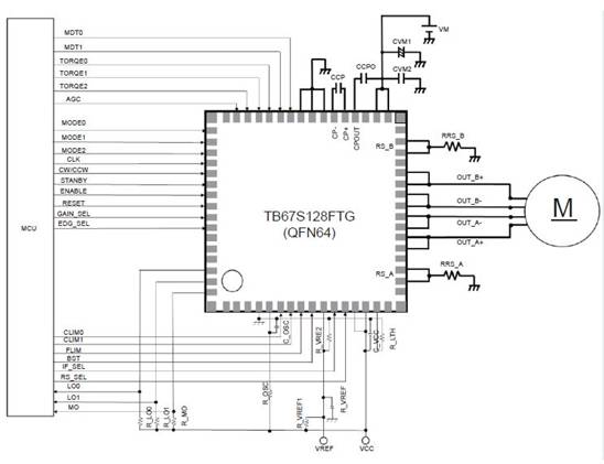 圖2:TB67S128電機驅(qū)動器的典型應用(來源:東芝)