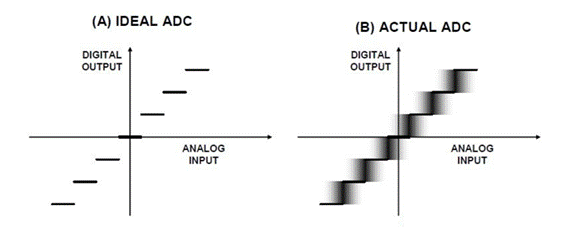 實(shí)際的 ADC 在許多方面與理想的 ADC 有偏差。折合到輸入端的噪聲肯定不是理想情況下會(huì)出現(xiàn)的,它對(duì) ADC 整體傳遞函數(shù)的影響如圖 1 所示。隨著模擬輸入電壓提高,"理想"ADC(如圖 1A 所示)保持恒定的輸出代碼,直至達(dá)到躍遷區(qū),此時(shí)輸出代碼即刻跳變?yōu)橄乱粋(gè)值,并且保持該值,直至達(dá)到下一個(gè)躍遷區(qū)。理論上,理想 ADC 的"代碼躍遷"噪聲為 0,躍遷區(qū)寬度也等于 0. 實(shí)際的 ADC 具有一定量的代碼躍遷噪聲,因此躍遷區(qū)寬度取決于折合到輸入端噪聲的量(如圖 1B 所示)。圖 1B 顯示的情況是代碼躍遷噪聲的寬度約為 1 個(gè) LSB(最低有效位)峰峰值。