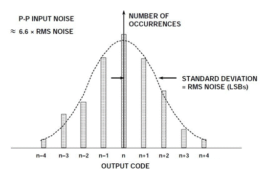 由于電阻噪聲和"kT/C"噪聲,所有 ADC 內(nèi)部電路都會(huì)產(chǎn)生一定量的均方根(RMS)噪聲。即使是直流輸入信號(hào),此噪聲也存在,它是代碼躍遷噪聲存在的原因。如今通常把代碼躍遷噪聲稱為"折合到輸入端噪聲",而不是直接使用"代碼躍遷噪聲"這一說法。折合到輸入端噪聲通常用 ADC 輸入為直流值時(shí)的若干輸出樣本的直方圖來表征。大多數(shù)高速或高分辨率 ADC 的輸出為一系列以直流輸入標(biāo)稱值為中心的代碼(見圖 2)。為了測(cè)量其值,ADC 的輸入端接地或連接到一個(gè)深度去耦的電壓源,然后采集大量輸出樣本并將其表示為直方圖(有時(shí)也稱為"接地輸入"直方圖)。由于噪聲大致呈高斯分布,因此可以計(jì)算直方圖的標(biāo)準(zhǔn)差σ,它對(duì)應(yīng)于有效輸入均方根噪聲。參考文獻(xiàn) 1 詳細(xì)說明了如何根據(jù)直方圖數(shù)據(jù)計(jì)算σ值。該均方根噪聲雖然可以表示為以 ADC 滿量程輸入范圍為基準(zhǔn)的均方根電壓,但慣例是用 LSB rms 來表示。