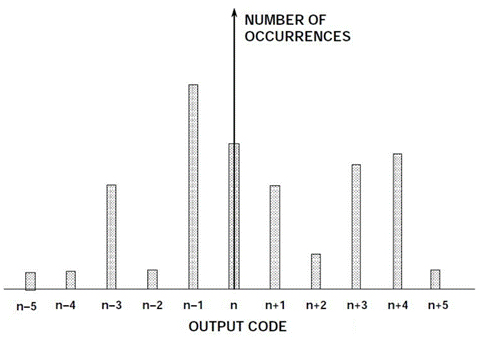 圖 2:折合到輸入端噪聲對(duì) ADC"接地輸入端"直方圖的影響(ADC 具有少量 DNL)