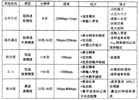 下表是對(duì)現(xiàn)有的幾種主要 ADC 類型作一簡(jiǎn)要總結(jié)。無論采用何種電路結(jié)構(gòu),若要提高轉(zhuǎn)換速度。就要以較低的分辨宰和較大的功耗來作為代價(jià):而要獲得較高的分辨率,則要犧牲轉(zhuǎn)換速度和功耗;為了降低功耗,卻又得不到較高的速度和分辨率。因此在系統(tǒng)應(yīng)用中,必須根據(jù)實(shí)際需要來選擇適當(dāng)電路結(jié)構(gòu)和技術(shù)指標(biāo)的 ADC。