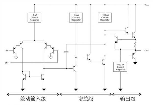 雖然各家廠商推出的運(yùn)算放大器性能與規(guī)格互有差異,但是一般而言標(biāo)準(zhǔn)的運(yùn)算放大器都包含下列三個(gè)部分。