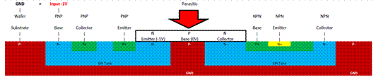 如圖4所標(biāo)注,PNP管的發(fā)射極,P基底和NPN管的集電極構(gòu)成了一個(gè)寄生的NPN管,當(dāng)運(yùn)放的輸入低于-0.3V時(shí)(比如-1V),寄生的NPN管的發(fā)射極比基極低-1V,這個(gè)電壓足夠使得寄生的NPN管導(dǎo)通,從而引起電流從集電極流向基極,這樣,原本原本隔離開的兩個(gè)晶體管之間就有了電氣連接,同時(shí)與GND之間也有了電氣連接,芯片將無法正常工作。