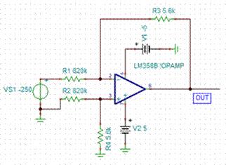 圖6是一個(gè)常見的電壓測量電路,LM358B由±5V供電,很容易可以推算出正常工作時(shí)Vout=VS1*(-R3/R1)=-250V*(-5.6/820)=1.71V。