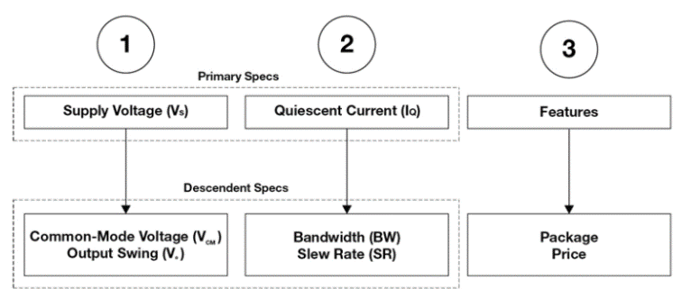 本文的目的是說明一種簡化的過程,該過程集中于選擇運(yùn)算放大器時(shí)的三個(gè)主要考慮因素,如圖1所示。前兩個(gè)考慮因素是電源電壓(Vs)和靜態(tài)電流(IQ)的主要規(guī)格)及其相應(yīng)的規(guī)范。次要規(guī)范定義為直接依賴于主要規(guī)范的規(guī)范。選擇一個(gè)沒有適當(dāng)?shù)闹饕?guī)格和次要規(guī)格的運(yùn)算放大器可能不適用于該應(yīng)用。第三個(gè)也是最后一個(gè)考慮因素涉