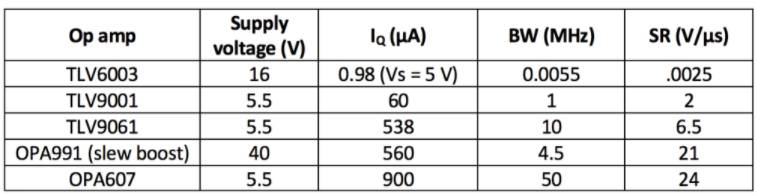 通常,Iq與SR直接相關(guān)(較高的Iq會(huì)產(chǎn)生更多的帶寬和更快的SR)。有一些針對特定用例設(shè)計(jì)的運(yùn)算放大器(例如具有壓擺升壓的運(yùn)算放大器),但通常,上述IQ,帶寬和SR之間的關(guān)系仍然成立。表2列出了五個(gè)Iq值不斷提高的運(yùn)算放大器及其相應(yīng)的帶寬和SR典型值。作為一般經(jīng)驗(yàn)法則,請嘗試選擇應(yīng)用需要更多帶寬和SR約25%至30%裕量的運(yùn)算放大器,以解決工藝和溫度變化的問題。低失真設(shè)計(jì)將需要更多的帶寬和SR。
