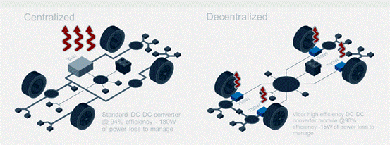 Vicor 全球汽車(chē)業(yè)務(wù)開(kāi)發(fā)副總裁 Patrick Wadden 認(rèn)為:“使用高密度積木式設(shè)計(jì)的 48V 分布式電源架構(gòu)才是更具優(yōu)勢(shì)的做法。而且,不管是混動(dòng)還是純電動(dòng)車(chē)都可以使用這樣的方法!