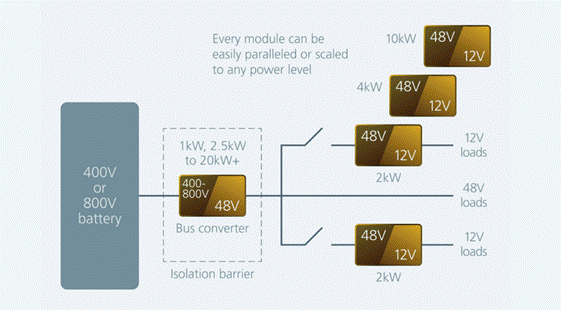 由于 400V 或 800V 配電的安全性要求,這種高壓隔離轉(zhuǎn)換器的分散非常困難而昂貴。然而,可利用電源模塊設(shè)計(jì)一種大功率集中式定比轉(zhuǎn)換器來(lái)代替大型 SilverBox DC-DC 轉(zhuǎn)換器。