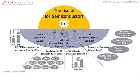 當(dāng)前的物聯(lián)網(wǎng)設(shè)備爆炸式增長將繼續(xù)推動物聯(lián)網(wǎng)半導(dǎo)體市場,并可能在產(chǎn)量提高的情況下進一步推動半導(dǎo)體創(chuàng)新。IoT Analytics關(guān)于此主題的最新報告預(yù)測,IoT半導(dǎo)體組件市場將從2020年的330億美元增長到2025年的800億美元,達到19%的復(fù)合年增長率。特別是,以下四個組件將成為人們關(guān)注的焦點:IoT微控制器(MCU),IoT連接芯片組,IoT AI芯片組以及IoT安全芯片組和模塊。