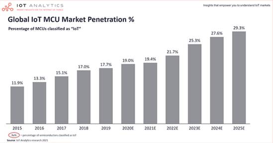 借助這些趨勢,IoT Analytics預(yù)計IoT MCU在一般MCU市場中的滲透率將從2019年的18%增長到2025年的29%。特別是32位MCU,例如,眾所周知的Raspberry Pi代表了IoT應(yīng)用的最佳選擇。