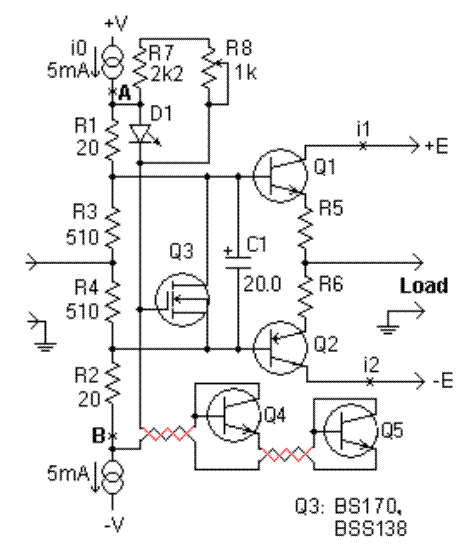 通過串聯(lián)更多的晶體管可以增加補(bǔ)償:使用兩個串聯(lián)的晶體管Q4和Q5,而不是只使用一個。所以電壓變化可以加倍。當(dāng)晶體管Q1和Q2不共用一個散熱器時,這也會有所幫助。然后,將Q4(Q5)與Q1(Q2)放置在同一個散熱器上以控制溫度。