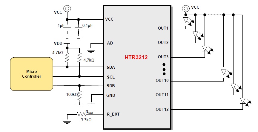 HTR3212是一款12路LED PWM驅(qū)動(dòng)器,PWM頻率可固定為3kHz或22kHz。每一路最大輸出電流可通過(guò)外置電阻REXT調(diào)節(jié),最大38mA,并可獨(dú)立控制4檔可選。每一路可通過(guò)I2C單獨(dú)控制256級(jí)細(xì)膩亮度調(diào)節(jié)。
