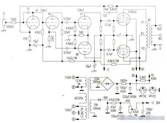 電路如圖1所示。輸出級(jí)采用兩只RCA公司的Gr50,B1為450V,B2為穩(wěn)壓的250V,采用50kΩ電位器調(diào)定固定柵負(fù)壓一30V。電路前級(jí)由12AU7作為對(duì)稱驅(qū)動(dòng)放大器,12AU7負(fù)載分割倒相和前置放大。不難看出,此前級(jí)放大電路為威廉遜放大器的同類,只不過(guò)將6SN7改為12AU7而已,本來(lái)前級(jí)三級(jí)電壓放大器閉環(huán)增益為20倍,在威廉遜放大器中輸入信號(hào)電壓1.9Vrms,輸出相位相反的兩組38Vrms驅(qū)動(dòng)信號(hào)。該機(jī)改用五極管Gr50,輸出級(jí)只需2×30Vp-p,即2×21Vrms,故前級(jí)輸入信號(hào)電壓只需1Vrms。由于輸出級(jí)采用五極管,其本級(jí)增益大為提高,為達(dá)到-20dB的負(fù)反饋,RNF:選用6.8kΩ,其負(fù)反饋量可改變RNF的值予以調(diào)整。