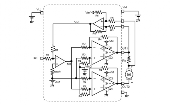 “在電機(jī)和輸出OUT1之間插入了用來檢測(cè)電流的電阻Rs,流經(jīng)電機(jī)的電流被檢測(cè)為電壓,并被負(fù)反饋到輸入級(jí)放大器。輸入級(jí)反相放大器根據(jù)該反饋對(duì)兩個(gè)輸出級(jí)功率放大器的輸出電壓進(jìn)行反饋控制。輸出級(jí)放大器是差分放大器,OUT1放大器使用反相輸入端接收輸入級(jí)放大器的輸出M0,而OUT2放大器使用同相輸入端接收,因此OUT2變成與OUT1相反的相位?傮w而言,可以將其視為單端輸入差分輸出(正相/反相)放大器。