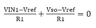 假設(shè)施加到輸入引腳IN1的電壓是VIN1,并且輸入級(jí)反相放大器的增益是無限大的,則反相輸入引腳的電壓將是Vref。