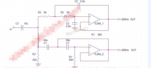 有源分頻電路(二分頻),分頻點(diǎn)在260Hz,上圖僅為一個(gè)聲道,另一聲道類(lèi)同,運(yùn)放IC可選擇1個(gè)4通道運(yùn)放TL084(電壓:7V-36V),或者選擇兩個(gè)NE5532(10-30v),JRC4580(4-32V)