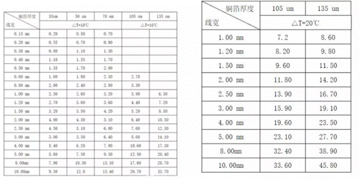 通過這兩個表,能得到的PCB布線經(jīng)驗是:增加銅厚、加寬線徑、提高PCB散熱能夠增強PCB的載流能力。