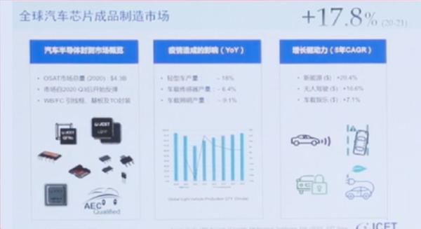 挑戰(zhàn)的另一面,全球汽車芯片成品制造亦面臨著機(jī)遇。隨著車載芯片功能日益復(fù)雜化,傳統(tǒng)車企逐漸拋棄全流程自主生產(chǎn)的 IDM 模式,而是將芯片設(shè)計(jì)、制造、封測環(huán)節(jié)委托給更專業(yè)的芯片玩家。據(jù)鄭力分享,2021 年全球汽車芯片成品制造有望同比增長 17.8%,車載芯片制造供應(yīng)鏈正開啟重組模式,有望引發(fā)全新機(jī)遇。