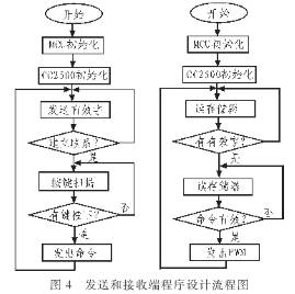 系統(tǒng)軟件的設(shè)計(jì)主要是MSP430F2249內(nèi)部的初始化和射頻芯片CC2500寄存器的設(shè)置以及發(fā)射、接受數(shù)據(jù)的讀寫操作。調(diào)用SimpliciTI協(xié)議棧中的BSP,MRFI,NWK,NWK APPLI CATION,其中BSP是最基礎(chǔ)的板級(jí)硬件,MCU初始化CC2500函數(shù)以及LED、按鍵操作函數(shù);MRFI是屬于射頻接口層,提供射頻芯片的選擇,射頻芯片的配置參數(shù),射頻芯片的驅(qū)動(dòng)以及通信接口,NWK和NWK_APPLICATION是網(wǎng)絡(luò)層和網(wǎng)絡(luò)應(yīng)用層,屬于SimpliciTI協(xié)議棧的內(nèi)容,包括網(wǎng)絡(luò)的建立,網(wǎng)絡(luò)地址的分配,網(wǎng)絡(luò)數(shù)據(jù)幀結(jié)構(gòu)、數(shù)據(jù)消息隊(duì)列,數(shù)據(jù)消息處理,網(wǎng)絡(luò)通信安全加密等一系列復(fù)雜機(jī)制,通過簡單的函數(shù)調(diào)用實(shí)現(xiàn)了基本的硬件操作。無線收發(fā)器發(fā)送端和接收端的軟件設(shè)計(jì)流程圖如圖4所示。