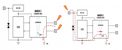 假設(shè)控制側(cè)均做了足夠的保護(hù)措施,當(dāng)控制側(cè)接口受到靜電放電時(shí),能量通過(guò)控制側(cè)保護(hù)器泄放至PE,對(duì)隔離通信接口基本無(wú)影響,如下面左圖;