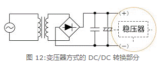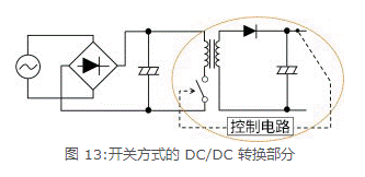 圖12和13是各AC/DC轉(zhuǎn)換方式的電路,但圈起來的部分是將DC電壓,轉(zhuǎn)換成想要的DC電壓的電路。在實際使用上,如果未利用該電路,轉(zhuǎn)換成穩(wěn)定且高精度的DC電壓,就無法產(chǎn)生電子電路所需要的電源。