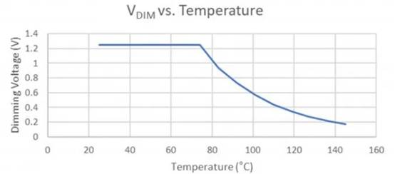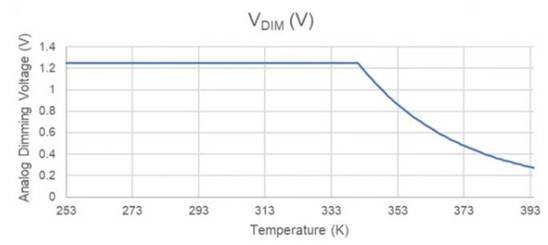 當(dāng)器件處于70°C或更低溫度時,參考電壓提供的1.25V電壓會限制DIM輸入,并且LED會提供550 mA的電流。一旦溫度超過70°C閾值,電阻分壓器輸出就會降至1.25V以下。然后,DIM輸入遵循電阻分壓器配置文件,隨著溫度持續(xù)升高,這會減小LED驅(qū)動電流。