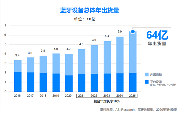 ・強(qiáng)勁復(fù)蘇將推動(dòng)藍(lán)牙設(shè)備年出貨量到 2025 年達(dá)到 64 億;