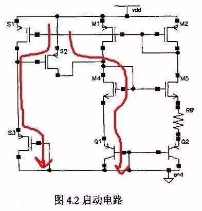 上電瞬間,S3自然是打開的,然后S2打開可以打開M4 Q1等,就打開了M1 M2,右邊恒流源電路正常工作,S1也打開了,就把S2給關(guān)閉了,完成啟動。如果沒有S1 S2 S3,瞬間所有晶體管電流為0。