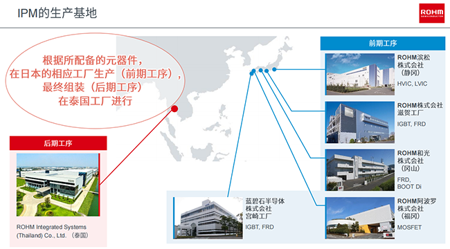 IPM作為一個(gè)功率模塊,里面包含很多的功率器件,ROHM所有的功率器件,包括前端,從晶圓到裸片的開發(fā),都是在日本的工廠完成。完成后,會(huì)送到泰國(guó)工廠做后續(xù)的封裝以及測(cè)試的工作。完成封裝、測(cè)試以后,然后再做全球的出貨、統(tǒng)配工作,可以說(shuō)所有產(chǎn)品保障都是由ROHM公司內(nèi)部完成。