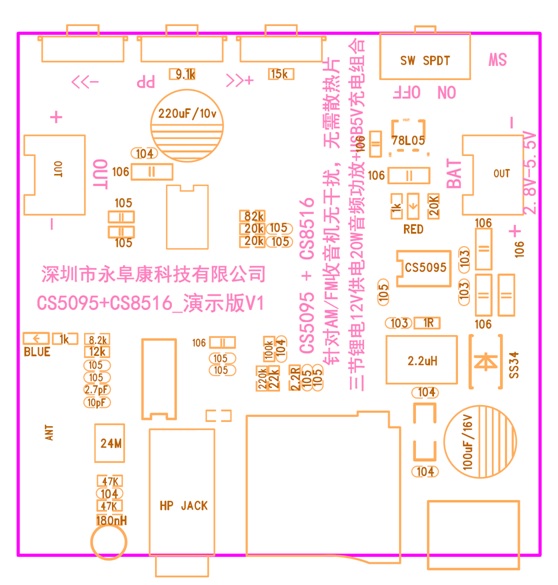 5. CS8516音頻功放+CS5095 USB5V三節(jié)鋰電充電管理一體演示板貼片圖