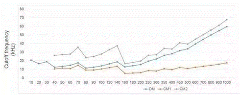 為了說明這個結(jié)論,我給出一些定量分析結(jié)果。這些EMI分析均基于AC/DC三相整流,拓撲為維也納整流。我分別給出了1Mhz和500Khz的共模噪聲,可以看出,500khz共模濾波器需要的截止頻率為19.2kHz,1MHz為31.2kHz。