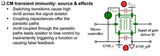 同時,選隔離芯片的時候也需要注意一個參數(shù)叫做CM transient immunity(肯定會給的),這個參數(shù)最好大于開關(guān)瞬間,橋臂中點電平的變化速率。光耦隔離這個參數(shù)一般在30kV/us,磁耦在35kV/us,電容耦合在50kV/us(是不是絕望了,都比氮化鎵低,硅器件一般在10kV/us,Sic 30kV/us)。