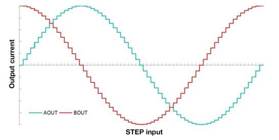 步進電機在其旋轉過程中以不連續(xù)的步幅移動,步距由步距角定義。它具有兩個電流繞組,每個電流繞組都可通過一個H橋進行控制。如圖1所示,步進電機驅動器將接近一個正弦波(藍色)的電流波形施加到一個線圈中,將一個余弦波(紅色)的電流波形施加到另一個線圈中。電流波形的一個(90度)象限對應于步進電機旋轉一個步長角-對于當今使用的大多數混合式步進電機為1.8度。